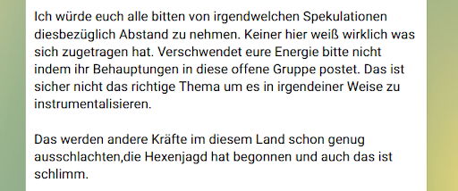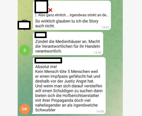 Im verschwörungsideologischen Spektrum ist das Framing als „Tragödie“ noch harmlos. In anderen Telegram-Gruppen, etwa der von Ignaz Bearth, wird der Fall so diskutiert, dass die Familie in den Tod getrieben worden sein, dass eine „Corona Kristallnacht“ bald bevorstehe (in Anspielung auf die Reichspogromnacht im Nationalsozialismus).