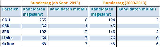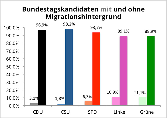 Ein Blick auf die Verhältnisse in den einzelnen Parteien zeigt: Gemessen an ihren Sitzplätzen im Parlament verzeichnen Bündnis90/Die Grünen mit 11,1 Prozent und die Linksfraktion mit 10,9 Prozent den höchsten Anteil von Abgeordneten mit Migrationshintergrund. Die SPD hat zwar in reellen Zahlen mit 12 Politikern den höchsten Wert, liegt jedoch mit 6,3 Prozent Anteil in der Fraktion eher im Mittelfeld. Schlusslicht sind die Unionsparteien mit 3,1 Prozent bei der CDU und 1,8 Prozent bei der bayerischen CSU.