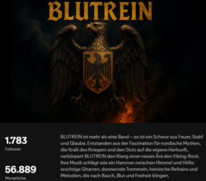 „Blutrein“ hat auf Spotify knapp 56.000 monatliche Hörer*innen. Lieder wie „Für mein Volk“, „Sturm über dem Vaterland“ und „Deutscher Patriot“ besingen einen überhöhten Nationalismus. Die Musik zeichnet ein kriegerisches Deutschland, das es im Kampf zu verteidigen gelte. Als Ersteller von „Blutrein“ ist der schwedische Musikproduzent Stefan Wasowski angegeben.