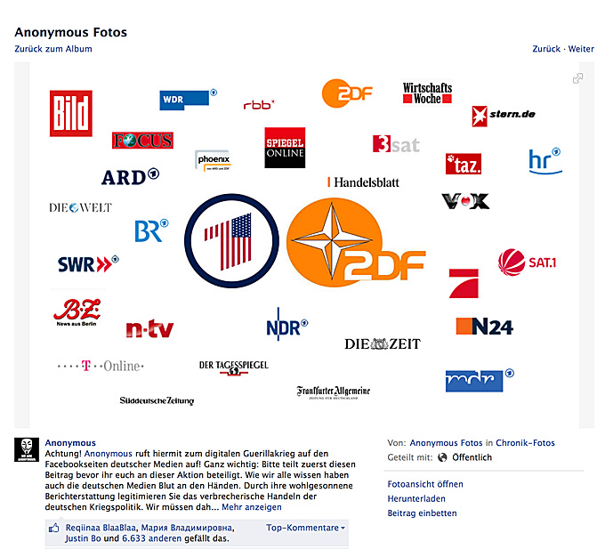 Auf Facebook rief die Seite „Anonymous“ zu einem „Guerilla-Krieg“ gegen Medien auf, Foto: Screenshot