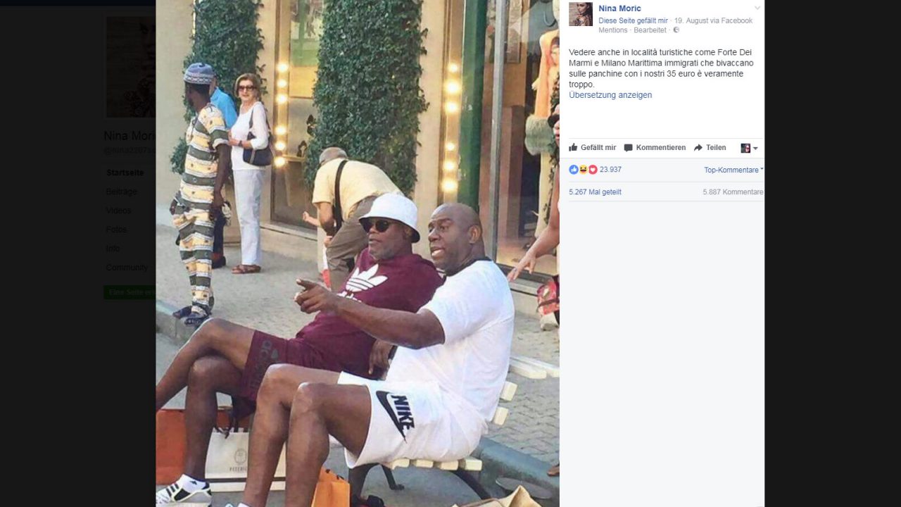 Tausende Nutzer griffen dieses Bild auf, erkannten nicht, dass es sich hier um zwei prominente Millionäre handelt und verbreiteten es in den sozialen Medien, um gegen Migrant_innen und Geflüchtete zu hetzen. Mit unschönen Worten machen sie ihrer Empörung Luft, dass diese „Migranten“ auf Staatskosten in Luxus-Geschäften shoppen gehen würden.