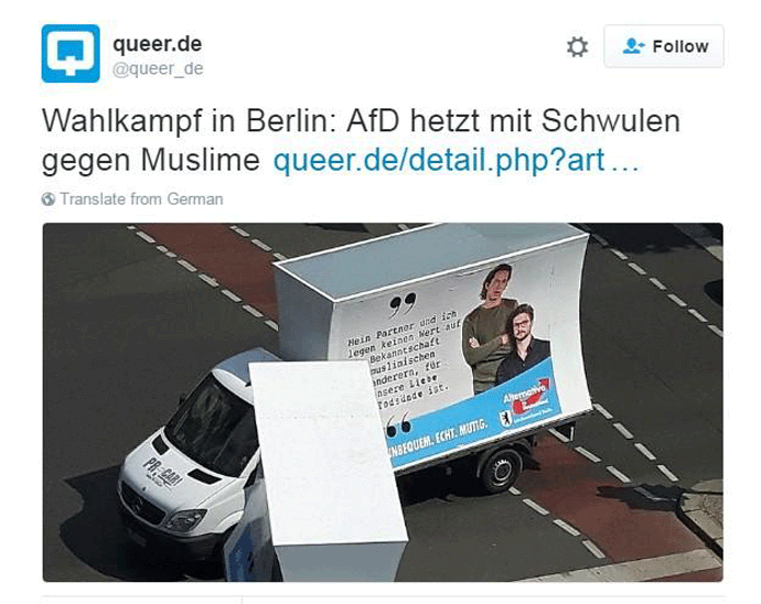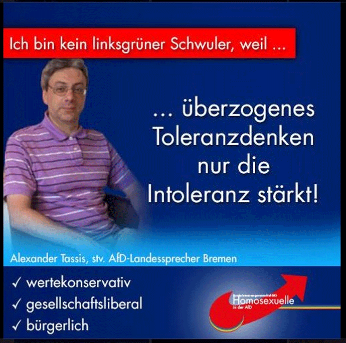 Jana Schneider, Vorsitzende der thüringischen „Jungen Alternative für Deutschland“ (Zitate aus Interview mit jetzt.de).“Mich widern ‚Berufsschwule‘ wie der Grüne Volker Beck an. Das muss man doch nicht immer so vor sich hertragen. Von dem fühle ich mich nicht vertreten.“ Vor fast zehn Jahren, nach der Bundeswehr, hat er sich geoutet. Viele Schwule hätten eher Probleme mit muslimischen Jugendlichen, die sie bedrohen, sagt Tritschler, als mit mangelnder deutscher Toleranz. Aber darüber rede niemand.Sven Tritschler, Vorsitzender der „Jungen Alternative“ und Mitarbeiter von Beatrix von Storch, im Interview mit jetzt.de.