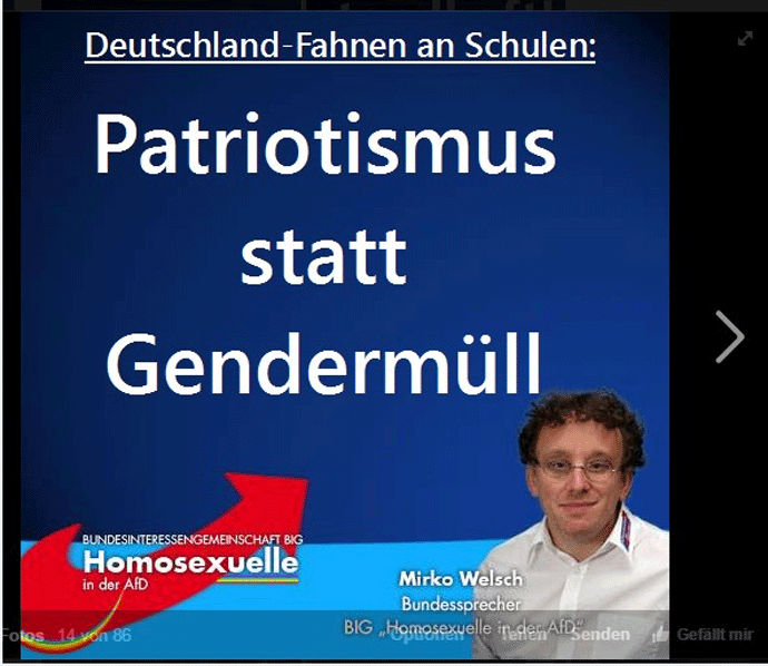 Mirko Welsch, 38, war in der AfD Saar aktiv und von 2014 bis 2017 Bundessprecher der „Bundesinteressengemeinschaft Homosexuelle in der AfD“; im März 2017 ist er nach eigenen Angaben aus der Partei ausgetreten, weil ihm die Politik des „rechtsnationalen Flügels“ um Björn Höcke zu radikal wurde (Zitate von Facebook-Posts und aus einem Interview mit dem Spiegel).
