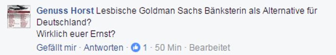 Offiziell erhält die 38-jährige Unternehmensberaterin Alice Weidel nach ihrer Wahl zur Spitzenkandidatin zur Bundestagswahl im Team mit Alexander Gauland viel Zuspruch. Gelobt wird ihr eloquentes und professionelles Auftreten, mit dem sie Islamfeindlichkeit und Rassismus ein bürgerliches Gesicht verleihen kann. Auf einem rechtspopulistischen Blog lobt ein Kommentator: “Weidel? die hat eben nicht nur die illegale Zuwanderung auf dem Schirm, sondern auch das viel gewaltigere Thema Euro und die direkte Demokratie! Und zieht zugleich das immer noch vernachlässigte weibliche Wählerpotential.”Auf Weides Facebook-Seite findet sich allerdings auch der Kommentar “Die unfähige Antifa hat Schaum vor dem Mund. So muss das sein.”, der ein etwas instrumentelleres Verhältnis zu Weidels Sexualität vermuten lässt. Es ist eine Kerbe, in die laut Tagesspiegel auch ein Delegierter auf dem Parteitag schlägt: Mit ihrer Regenbogenfamilie könne sie die Vorwürfe, die AfD sei homofeindlich, endlich Lügen strafen.