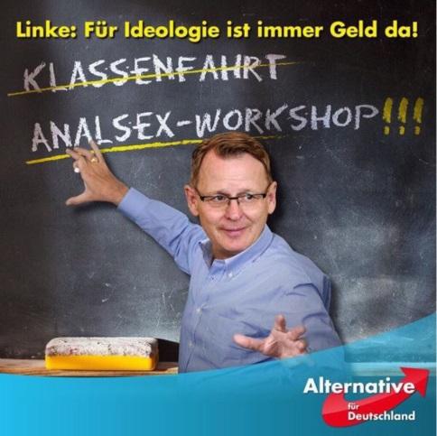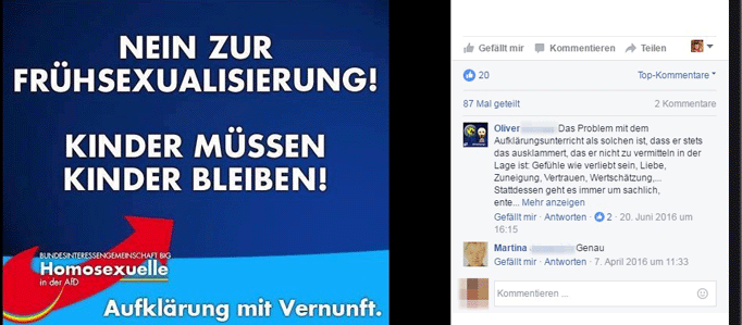 Wenn sich etwa reaktionäre Christ_innen um Beatrix von Storch mit den „Demos für alle“ gegen die gleichgeschlechtliche Ehe und gegen Aufklärung über sexuelle Vielfalt in Schulen wenden, ist dies zumindest gegen homosexuelle Kinder und Eltern gerichtet, denen verwehrt wird, ihr Leben als gleichberechtigt und gleichwertig zu begreifen; Gender-Mainstreaming sieht die Partei als „politische Geschlechtsumwandlung“.Dazu gehört auch die oft in diesen Kreisen verwendete wahrheitswidrige Gleichsetzung von Homosexualität und Pädophilie.Björn Höcke (AfD Thüringen) spricht von „Bildungspolitik für den Arsch“ und lügt auf Facebook, Geld für Schulausflüge fließe neuerdings in Analsex-Workshops, mit denen die Kinder schon in der Schule verdorben würden: „Für Bodo [Ramelow, Die Linke, Thüringens Ministerpräsident] ist Analsex pädagogisch wertvoller“.Aus einer Debatte im Landtag Sachsen-Anhalt über vermeintlich sichere Herkunftsländer: „Wer Homosexualität offen auslebt, dem droht dafür eine Gefängnisstrafe.“ Zwischenruf Andreas Gehlmann, AfD: „Das sollten wir in Deutschland auch machen.“Corinna Herold von der AfD Thüringen will in einer „kleinen Anfrage“ im Landtag wissen, wie viele Homo-, Bi- und Transsexuelle in Thüringen leben und warum sie „besonders schutzbedürftig“ seien (2015, Tagespiegel).In Baden-Württemberg zieht die AfD „gegen die volkserzieherische Überhöhung von nicht heterosexuellen Menschen“ in den Wahlkampf.AfD-Vorsitzende Frauke Petry moniert u.a., dass „fast kein Spielfilm in Deutschland mehr […] ohne das schwule Pärchen“ auskomme, sie also Angst habe, dass Homosexualität zum Standard erhoben werde.Andreas Nerstheimer, inzwischen aus der Fraktion ausgeschlossener Berliner AfD-Kandidat, bezeichnete Homosexuelle als „degenerierte Spezies“.