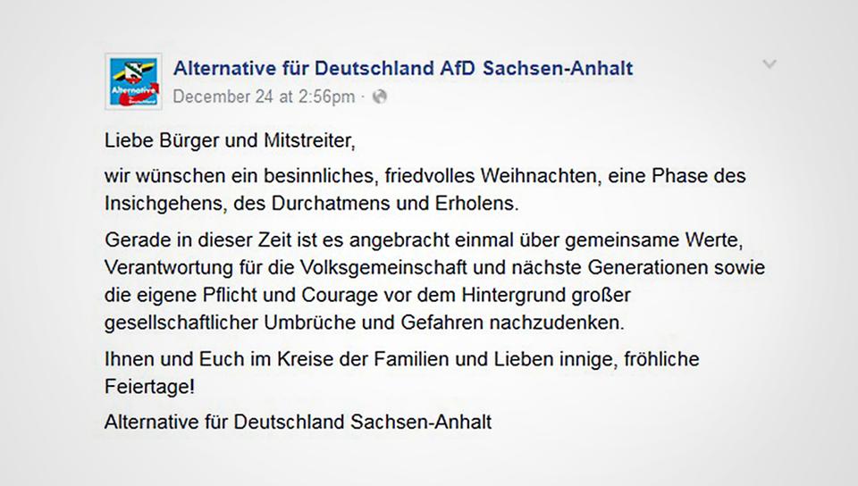 Poggenburg gehört zu Björn Höckes engsten Verbündeten und war ebenfalls dabei, als Höcke seinen Vortrag beim „Institut für Staatspolitik“ hielt. Die Debatten um Höckes Entgleisungen waren gerade verklungen, da verbreitete sein Landesverband via Facebook einen Post, der allen Bürger_innen und Mitstreiter_innen „ein besinnliches, friedvolles Weihnachtsfest“ wünschte und hinzufügte, dies sei die rechte Zeit, um einmal über „gemeinsame Werte“ und „Verantwortung für die Volksgemeinschaft“ nachzudenken. Volksgemeinschaft?