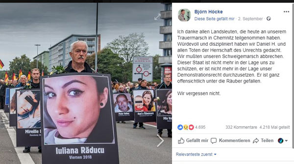 Aber dafür kann die AfD ja nichts! Die wollte ja nur trauern. Oder? Wir haben aus den letzten Tagen zusammengetragen, was AfD-Funktionäre so über die Ereignisse in Chemnitz nicht nur denken, sondern auch offen in Soziale Netzwerken schreiben. Lassen Sie diese Aussagen einfach wirken. Alle Posts zwischen 27.08.2018 und 04.09.2018.