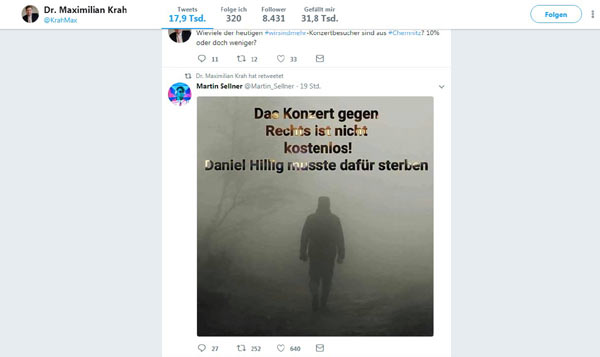 Auch ansonsten hat der Rechtsanwalt seine Feindbilder fest. Nach dem Konzert #wirsindmehr am Montag twittert er mit Zahlen ohne Quellen: #Ihrseidnichtmehr.
