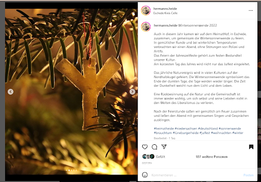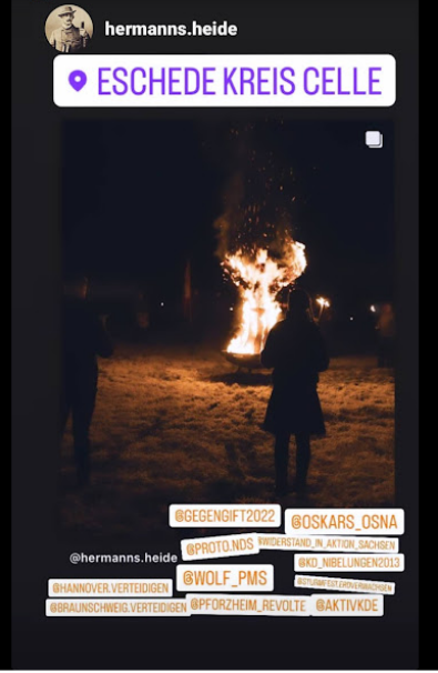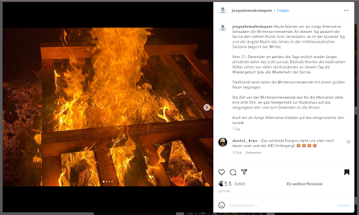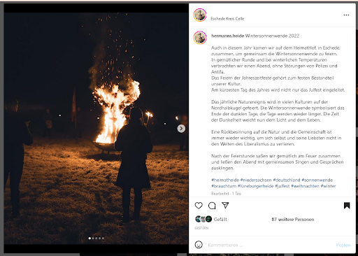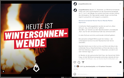 Ein virtueller Spaziergang durch die deutschsprachige rechtsextreme Welt auf Instagram zeigt dieser Tage denn auch viel Feuer. Denn wer bei einem ordentlichen Wintersonnwendfeuer anwesend war, vielleicht auch Lebensrunen an Tannenbäume gehängt hat, möchte damit auch digital hausieren gehen – egal ob Burschenschaftler, Mitglied der Identitären Bewegung, Kampfsportler-Veranstalter oder Rechtsrock-Label.