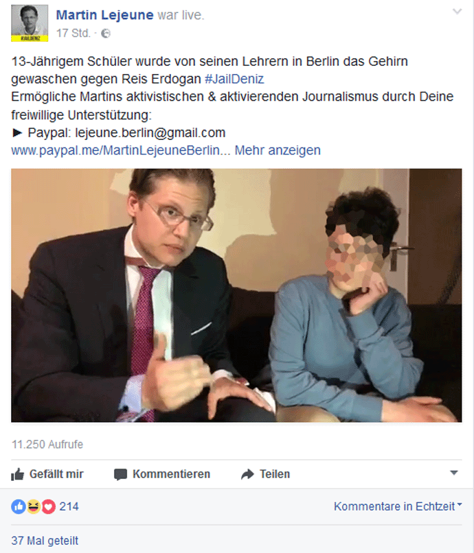 So geschah es auch auf dem #FreeDeniz-Event am Mittwoch, von dem Lejeune seiner Anhängerschaft via Facebook live berichtete. Nach der Veranstaltung filmte Lejeune im Livestream weiter, wie er einem 13-jährigen Jungen, der Erdogan kritisch gegenüber steht, umzustimmen versucht. Der Erfolg ist nicht auf seiner Seite.