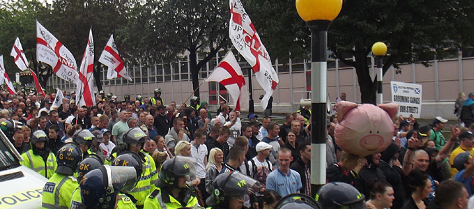 Es ist das Jahr 2009, in der englischen Kleinstadt Luton nahe London. Als ein Bataillon britischer Soldat_innen aus dem Irak zurückkehrt, wird ihnen zu Ehre eine Parade veranstaltet. Am Straßenrand: Etwa 15 Mitglieder der radikal islamischen Bewegung Ahle Sunnah al Jamah, die die Soldat_innen beschimpfen und Plakate mit der Aufschrift „Britische Regierung, Terroristische Regierung“ hochhalten. Auch wenn der Zwischenfall nur klein war, dient er als Katalysator für die Gründung der English Defence League, einer rechtsradikalen islamophoben Straßenbewegung mit exzellenter Anbindung an Hooligankreise. Ihr Gründer: Der wegen eines Angriffs auf Polizisten verurteilte Bräunungsstudiobetreiber Stephen Yaxley-Lennon. Das ehemalige Mitglied der faschistischen „British National Party“ (BNP) nennt sich von nun an, in Anlehnung an einen bekannten Fußball-Hooligan, Tommy Robinson.