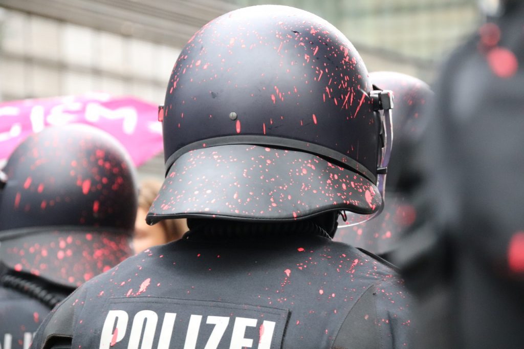 Eine Farb-Attacke der Gegendemonstrant*innen traf lediglich Polizei-Beamte.