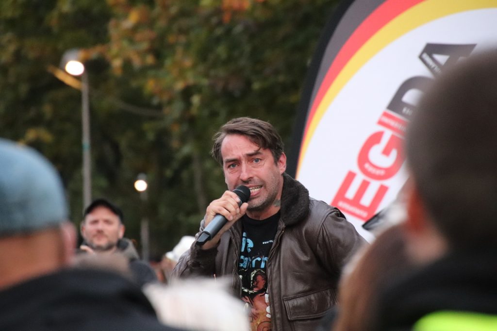 Zum Schluss durfte dann auch noch Sven Liebich auf einem Plastikstuhl stehend hetzen. Vorher wünschte er sich noch die Vergewaltigung der „Omas gegen rechts“.