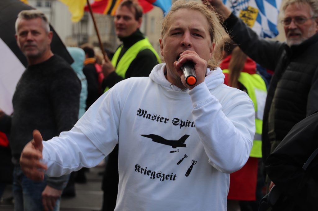 Ein Teilnehmer beschallte die Demonstrant*innen mir rechtem schwurbel-Querfront Rap.