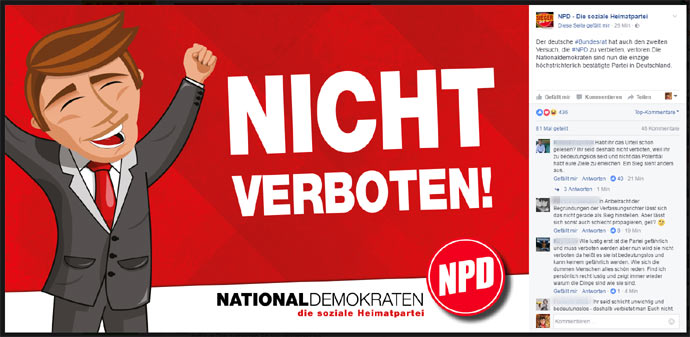 Und die NPD feiert auf Facebook: „Der deutsche #Bundesrat hat auch den zweiten Versuch, die #NPD zu verbieten, verloren.Die Nationaldemokraten sind nun die einzige höchstrichterlich bestätigte Partei in Deutschland.“