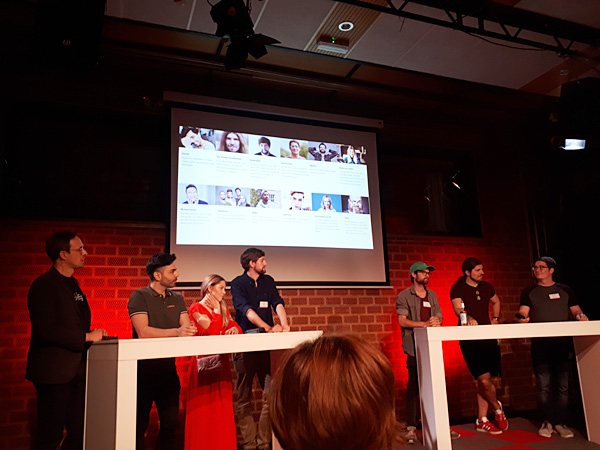 Auf der Pressekonferenz in Berlin: Henning Dorstewitz (YouTube), Emrah, Diana zur Löwen und RobBubble, NiksDA, Alex und Maximnoise (v.l.)