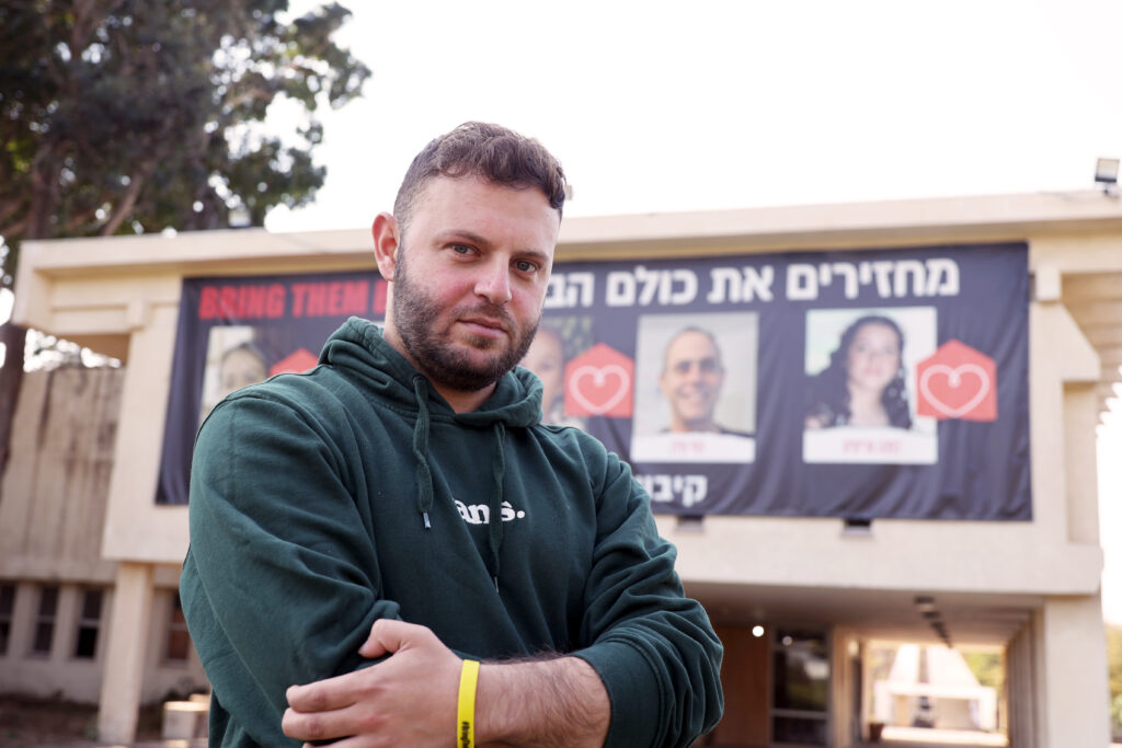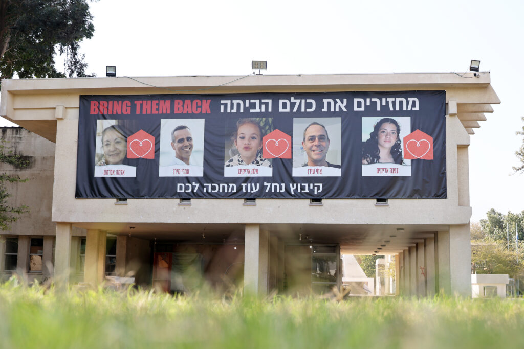 Der Rundgang endet im Zentrum des Kibbuz, wo die alte Kantine steht. An der Fassade des cremefarbenen Betonbaus steht ein großes Transparent mit Namen und Fotos der acht Entführten aus der Community, die jüngsten waren erst acht und 15 Jahre alt. Fünf kamen im November 2023 durch einen Deal frei, einer wurde in Geiselhaft ermordet und im Februar an Israel übergeben.