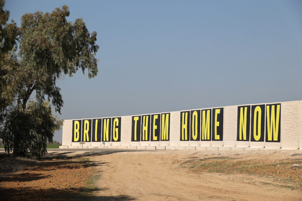 Es ist ein sonniger Wochentag Ende Januar, wenige Tage nachdem ein Waffenstillstand zwischen der Hamas und Israel am 19. Januar in Kraft getreten ist. Bis heute ist die Straße hinter den Soldaten nach Nahal Oz für normalen Verkehr gesperrt. Eine hohe Betonmauer schützt den kurzen Weg vor Artilleriebeschuss aus dem palästinensischen Küstenstreifen, darauf prangen in Großbuchstaben die Worte: „Bring them home“ – gemeint sind die Entführten.