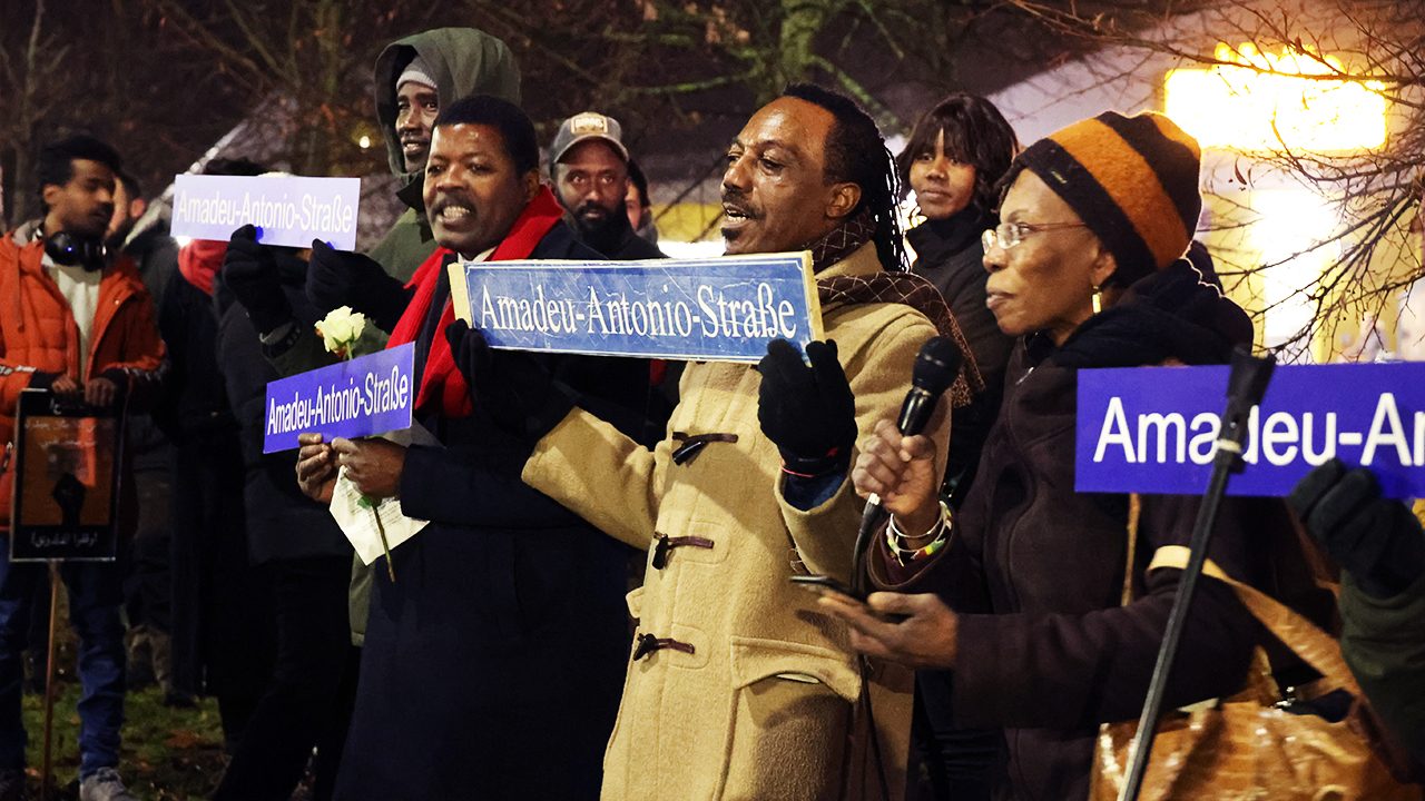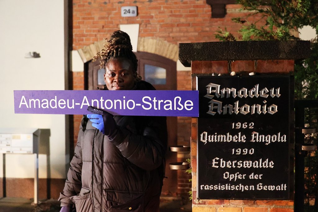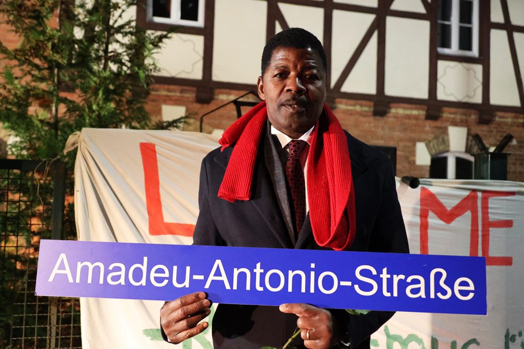 Am Rande der Trauernden hält ein Mann im Anzug ein Schild hoch, auf dem „Amadeu-Antonio-Straße“ steht. Der 61-Jähriger heißt Neves, stammt ebenfalls aus Angola, war früher mit Amadeu Antonio befreundet. Eine Liebe für Motorräder hat die beiden Männer damals verbunden. Auch Neves war Vertragsarbeiter in der DDR: Im Werk des „Industrieverband Fahrzeugbaus“ im brandenburgischen Ludwigsfelde montierte er Nutzfahrzeuge. Bis heute kämpft er um seine Löhne von damals, wie viele Vertragsarbeiter aus den „sozialistischen Bruderländern“.