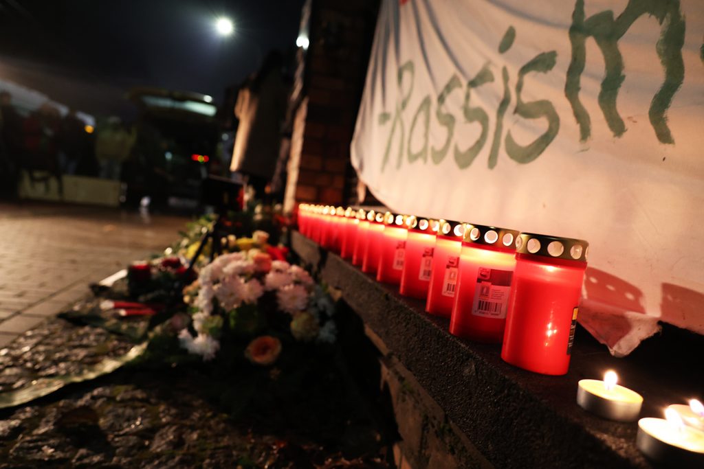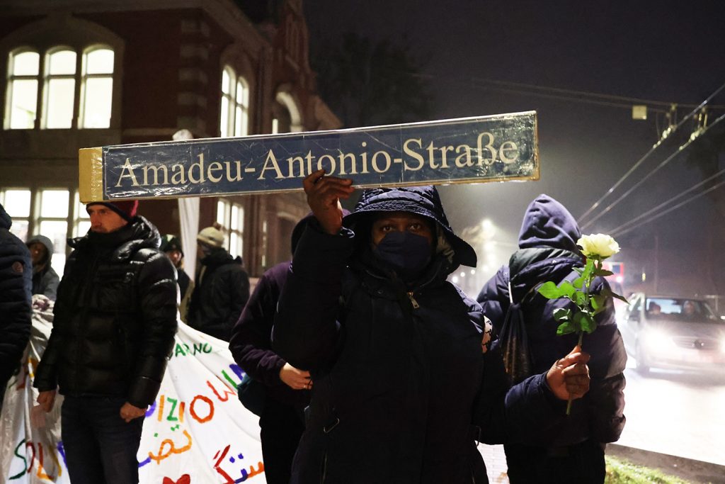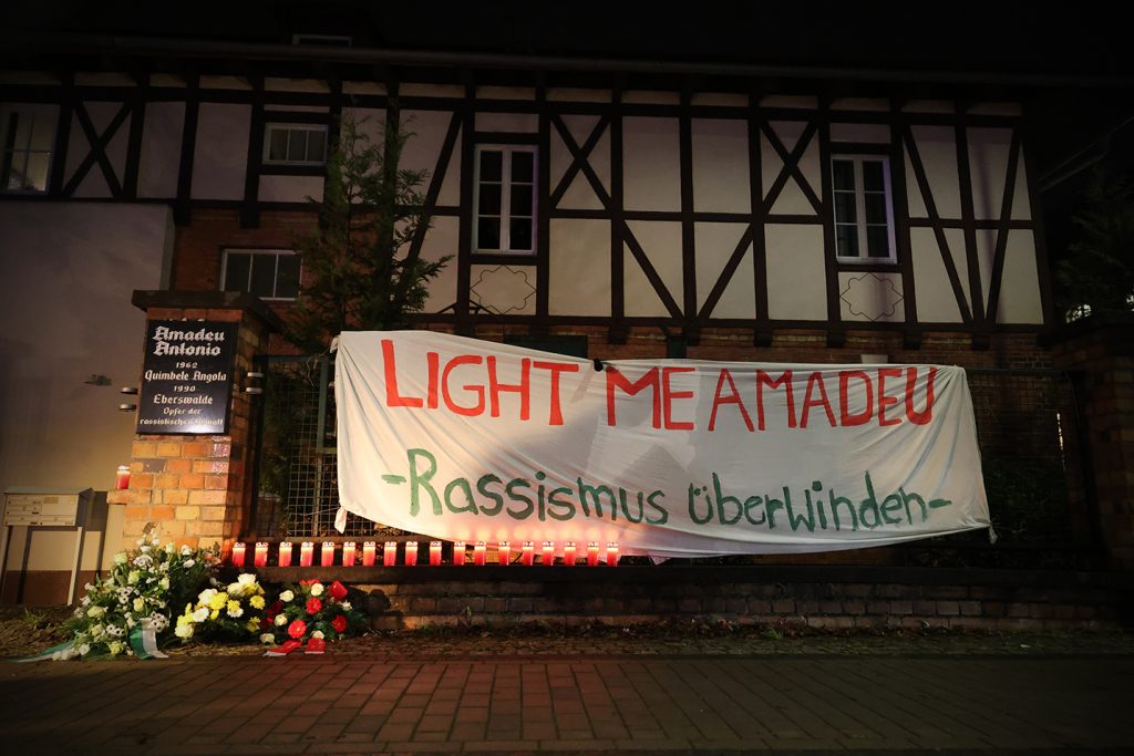 An dieser Stelle 1990 schlugen Neonazis mit Lattenzäunen und Baseballschlägern Amadeu Antonio brutal zusammen, während die Polizei zusah. Elf Tage später, am 6. Dezember, starb er – eines der ersten Todesopfer rechter Gewalt im wiedervereinigten Deutschland. Heute, 32 Jahre später, haben sich rund 150 Menschen am Tatort an der Bundesstraße 167 in Eberswalde versammelt, um dem angolanischen Vertragsarbeiter Amadeu Antonio zu gedenken. Ein stiller Trauermarsch darf für kurze Zeit die Straße zurückerobern, einen Teil davon wollen Antonios Freunde und Familie seit Jahren nach ihm umbenennen lassen. Hier, wo heute ein griechisches Restaurant steht, legen sie Blumen nieder, zünden Kerzen an. Der Moment der Trauer wird aber immer wieder von hupenden oder rasenden Autos unterbrochen.